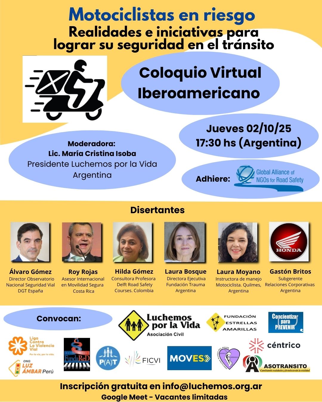 Quedan pocos días para inscribirse, gratuitamente, al Coloquio Virtual Iberoamericano "Motociclistas en Riesgo en Iberoamérica: Realidades e iniciativas para lograr su seguridad en el tránsito" que se realizará el próximo jueves 02 de octubre a las 17:30 hs (hora de Argentina) hasta las 19:30 hs para compartir exposiciones y experiencias nacionales e internacionales con invitados especiales, ONG y asistentes, y así sumar esfuerzos para salvar vidas.