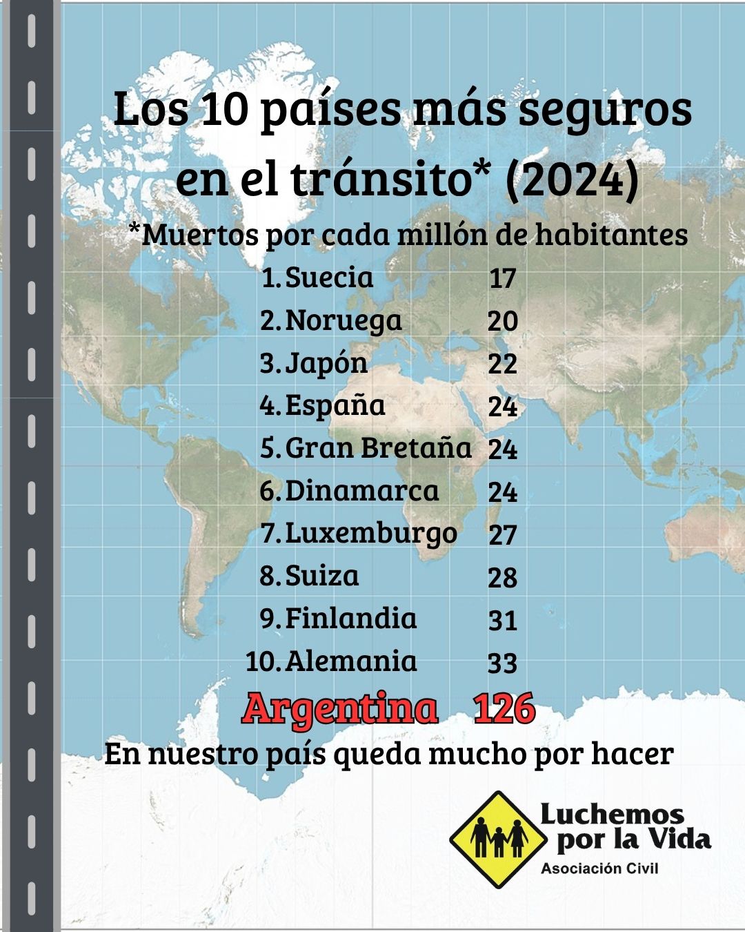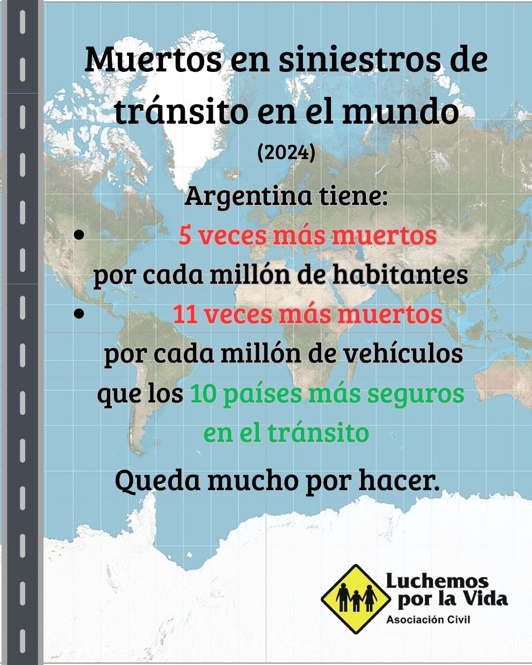 Según las estadísticas de mortalidad en el tránsito relevadas por Luchemos por la Vida a nivel mundial, Argentina tiene 5 veces más muertes por cada millón de habitantes y 11 veces más muertes por cada millón de vehículos que los 10 países más seguros del mundo en el tránsito.