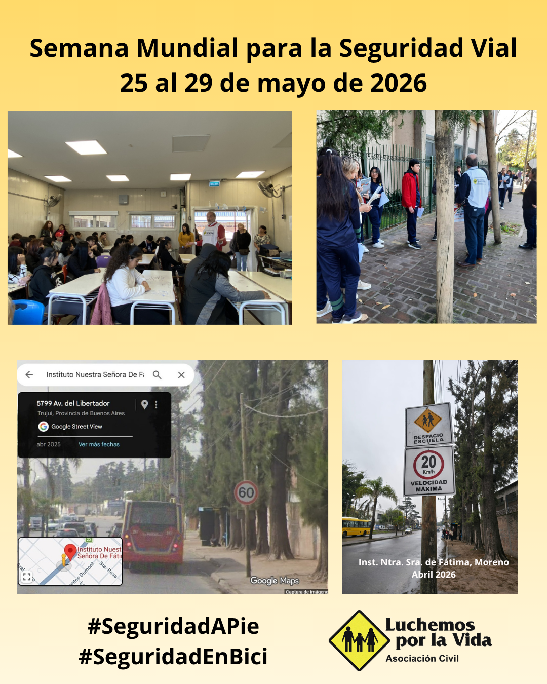 Luchemos por la Vida desarrollará diferentes actividades educativas, e invita especialmente a las escuelas a sumarse junto a sus estudiantes para reflexionar acerca de la “Seguridad en el tránsito en el entorno escolar”, preguntando “¿Nos movemos seguros al llegar y salir de la escuela?”.